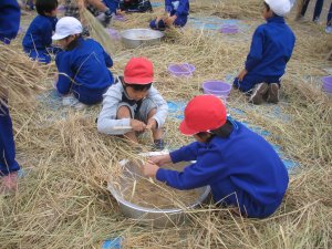 | 10月20日 脱穀作業 割り箸や千場 モータ付きの小さな脱穀機 で稲から籾を離しました。 |