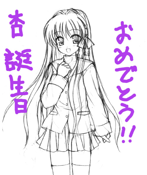 関係ないこともしたり(ぉ 塗ってて思ったんですが、誕生日記念ということでむりやり描いただけで、たいして出来もよくなく、結局塗りにまでいけなかったものを今更塗るっていうのもどうなの?(駄 他のやつ描いた方がよかったような気がしないでもないですが、まぁ、いいか(ぉぃ なんか、右手が服をはだけようとしてるかのように見えるなぁ。「杏、誕生日おめでとう!」「ありがと〜。お礼に・・・」